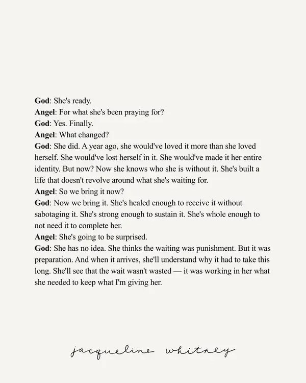God: She has no idea. She thinks the waiting was punishment. But it was preparation. And when it arrives, she’ll understand why it had to take this long. She’ll see that the wait wasn’t wasted — it was working in her what she needed to keep what I’m giving her.