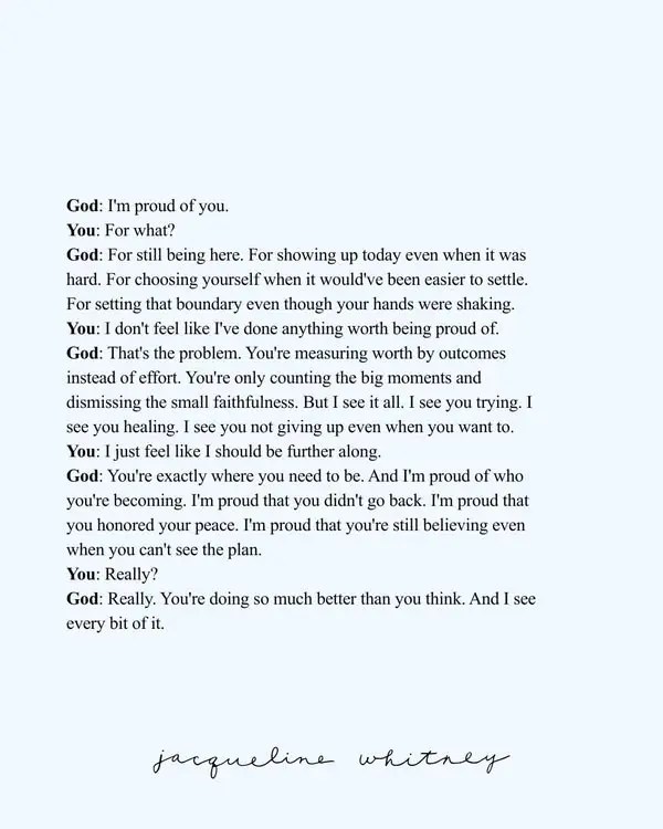 God: That’s the problem. You’re measuring worth by outcomes instead of effort. You’re only counting the big moments and dismissing the small faithfulness. But I see it all. I see you trying. I see you healing. I see you not giving up even when you want to.